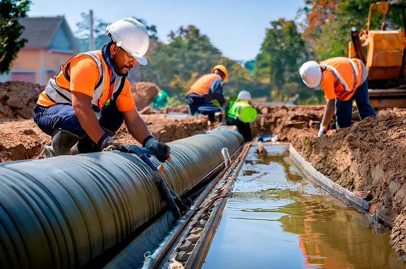 Desenvolvemos e executamos projetos de saneamento básico, incluindo redes de água, esgoto e drenagem pluvial.